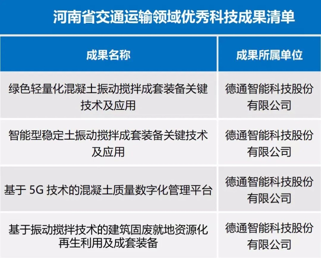 大會(huì)上發(fā)布了三十七項(xiàng)河南交通運(yùn)輸領(lǐng)域優(yōu)秀科技成果清單,德通智能科技股份有限公司的《綠色輕量化混凝土振動(dòng)攪拌成套裝備關(guān)鍵技術(shù)及應(yīng)用》、《智能型穩(wěn)定土振動(dòng)攪拌成套裝備關(guān)鍵技術(shù)及應(yīng)用》、《基于5G 技術(shù)的混凝土質(zhì)量數(shù)字化管理平臺(tái)》、《基于振動(dòng)攪拌技術(shù)的建筑固廢就地資源化再生利用及成套裝備》4項(xiàng)技術(shù)成果列入河南省交通運(yùn)輸領(lǐng)域優(yōu)秀科技成果清單。