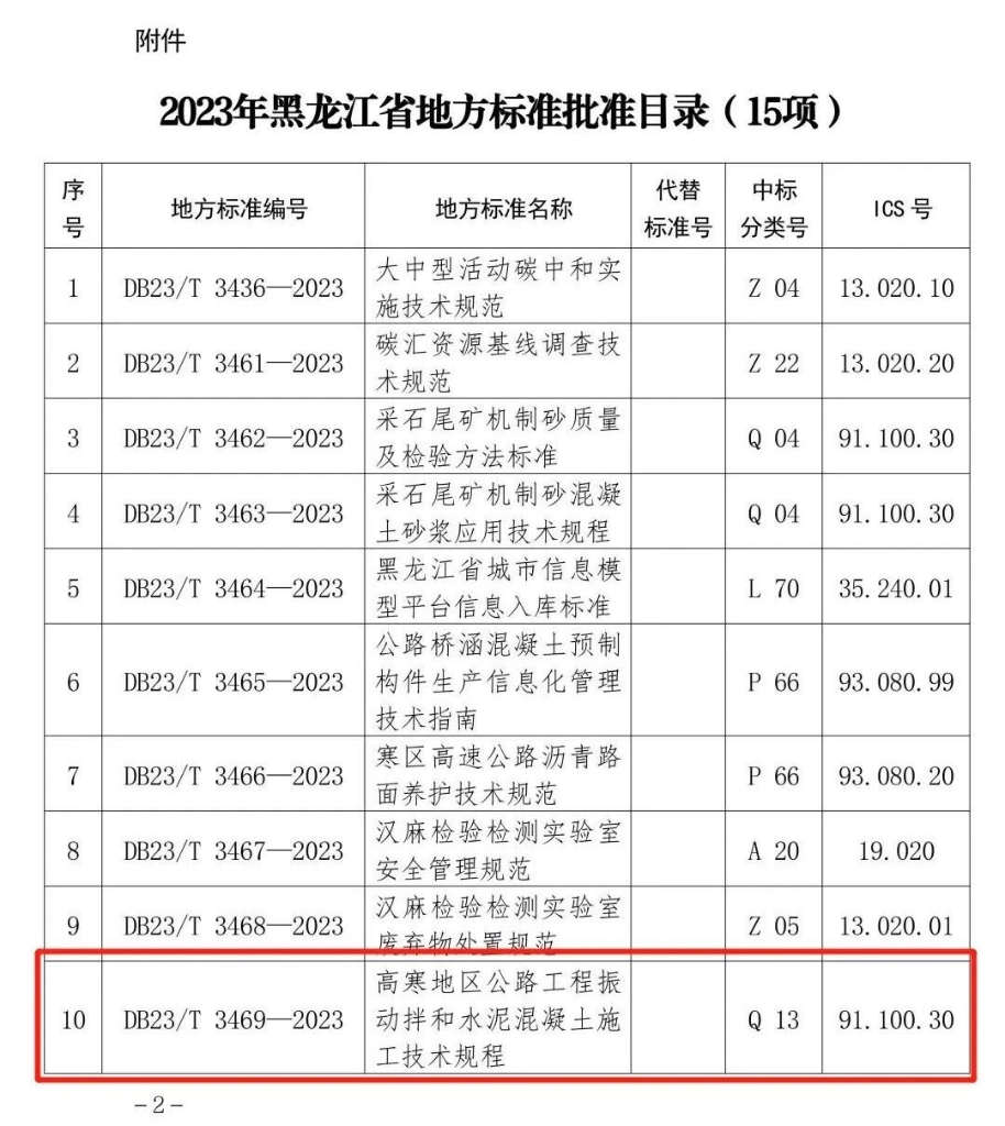 近日,黑龍江省市場(chǎng)監(jiān)督管理局發(fā)布了關(guān)于批準(zhǔn)《大中型活動(dòng)碳中和實(shí)施技術(shù)規(guī)范》等15項(xiàng)地方標(biāo)準(zhǔn)的公告,《高寒地區(qū)公路工程振動(dòng)拌和水泥混凝土施工技術(shù)規(guī)程》獲批頒布。