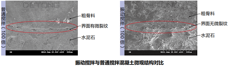 普通攪拌時(shí),由于微觀均勻性不足,粗骨料和水泥石的界面處是薄弱環(huán)節(jié),經(jīng)常存在微裂紋,影響宏觀力學(xué)性能和耐久性;振動(dòng)攪拌時(shí),粗骨料和水泥膠漿間的相互高頻顫振強(qiáng)化了二者的界面,硬化后粗骨料和水泥石的界面處無微裂紋,宏觀力學(xué)性能和耐久性得到提升。